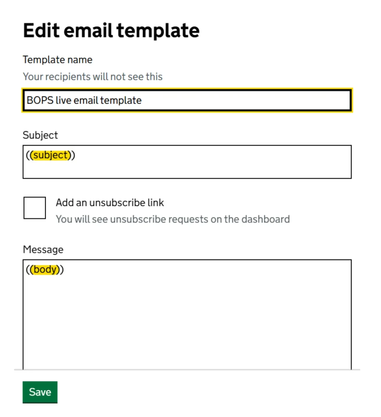 Give the letter template a name, for example ‘BOPS live neighbour consultation letter’ and enter the subject and message text exactly as shown in the screenshot below. Then, save the template